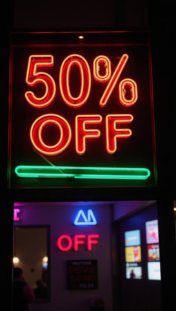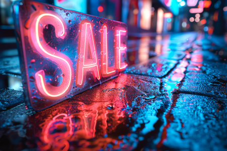 Neon 'Sale' sign on a rainy street at night, ideal for promotions. With Generative AI technology.