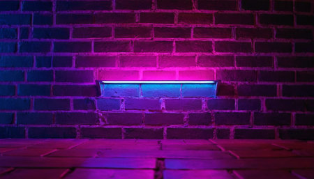 Retro urban scene with pink neon lights on vintage brick wall, perfect for creative designs