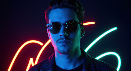 A man wearing glasses and a black coat is standing in front of a neon sign. The image has a cool and futuristic vibe, with the neon sign adding to the overall atmosphere