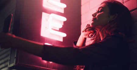 A young woman poses thoughtfully beside a bright neon sign on a city street at night, glowing in vibrant pink and yellow hues.