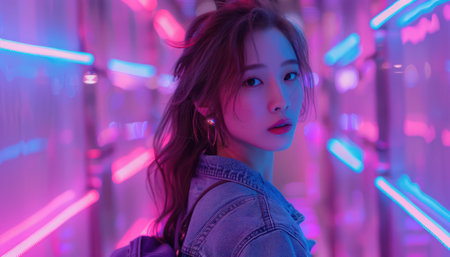 A captivating portrait of a young woman bathed in the vibrant neon glow of a futuristic cityscape Her enigmatic gaze and the dynamic interplay of light and shadow create a mesmerizing visual narrative This image is perfect for modern and futuristic design inspiration, artistic photography enthusiasts, and anyone seeking a touch of cyberpunk allure AI Generative
