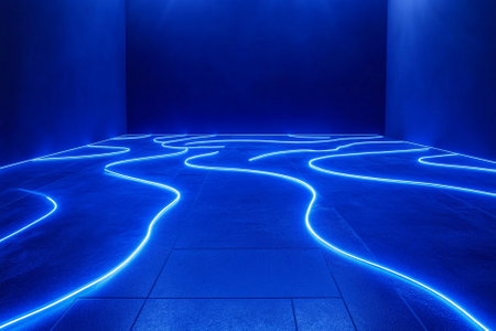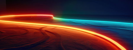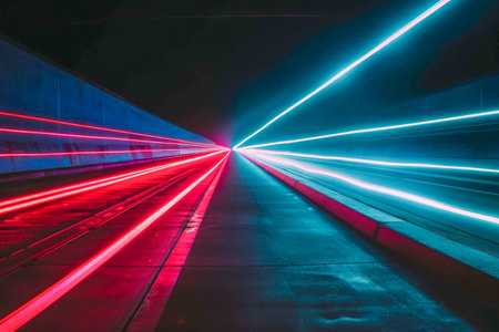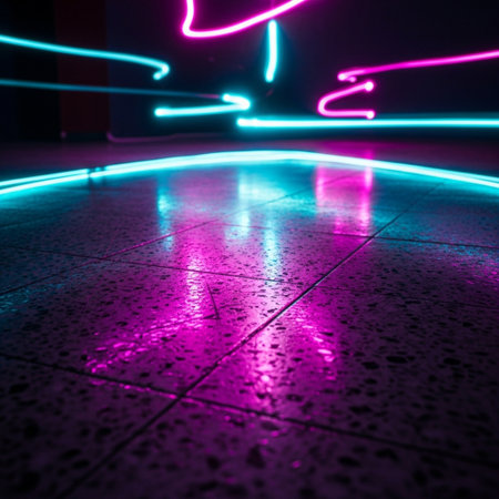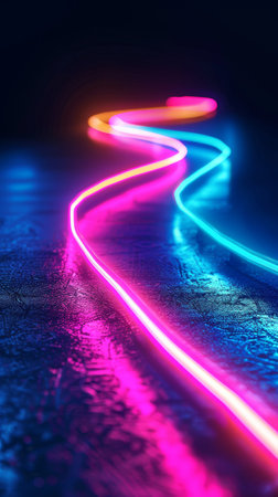 Neon light trail on wet floor at night, vibrant colors photography, modern technology concept