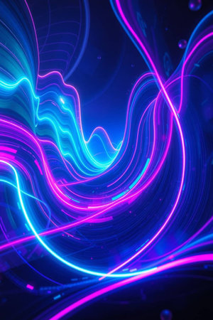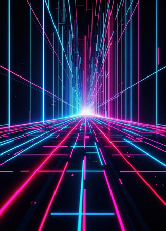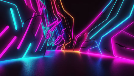 This digital artwork showcases a dynamic blend of neon colors and electric lighting, creating a futuristic and energetic mood. Perfect for enhancing nightlife and entertainment promotions, event posters, and digital media. The abstract style appeals to modern designers and marketers in the entertainment industry. AI-generated digital illustration. AI-generated illustration.