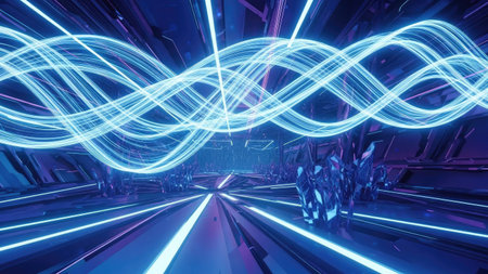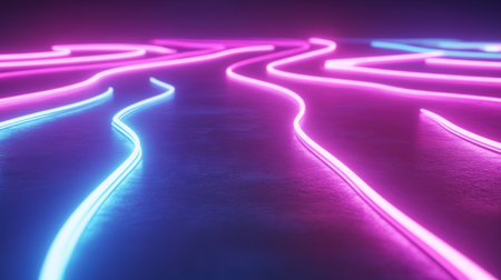 This image presents a futuristic tunnel design with flowing neon light patterns. The scene incorporates blue and purple hues, creating a visually dynamic composition. The lighting and perspective suggest a sense of depth. Suitable for various applications, this design can be used for technology, design, or commercial uses.