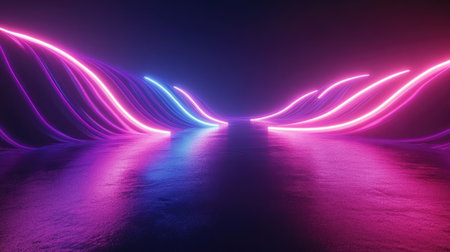 Dynamic 3D render of a neon wave with a dark setting and bright floor reflection, perfect for backgrounds, covers, and digital wallpapers.