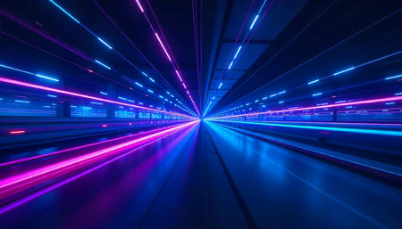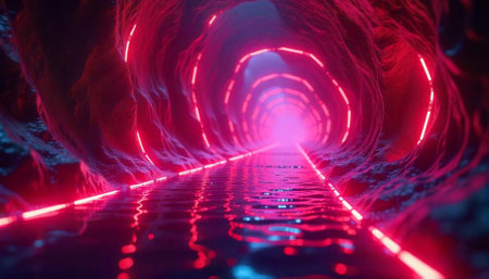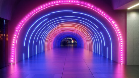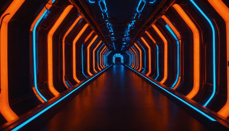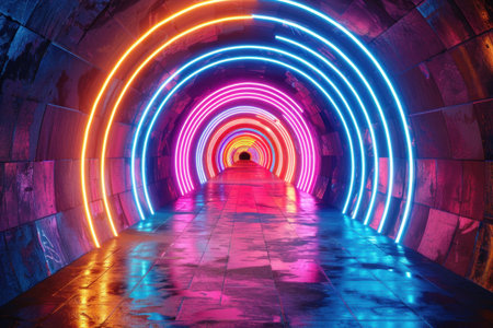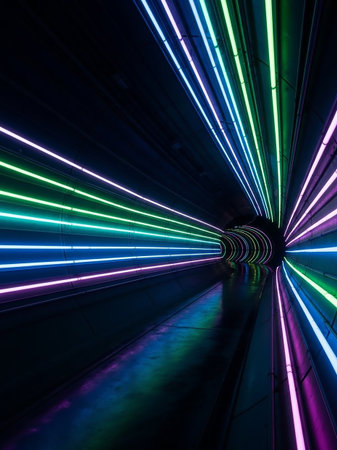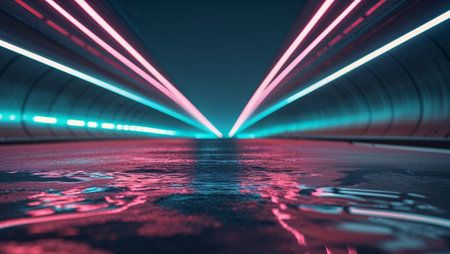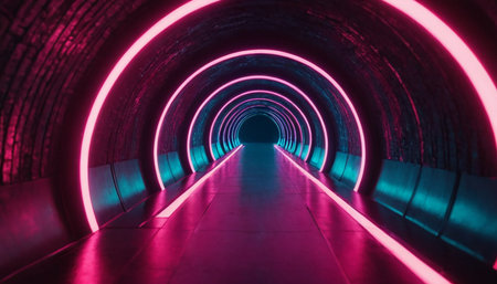 A tunnel illuminated by neon lights running through the middle, casting a vibrant glow on the surroundings. The tunnel stretches ahead, creating a futuristic and colorful pathway