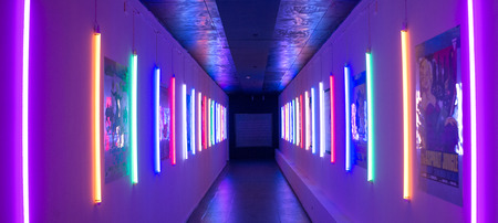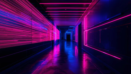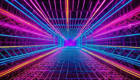 Neon-lit tunnel illuminated lights in dimly lit room creates abstract geometric grid colorful rays