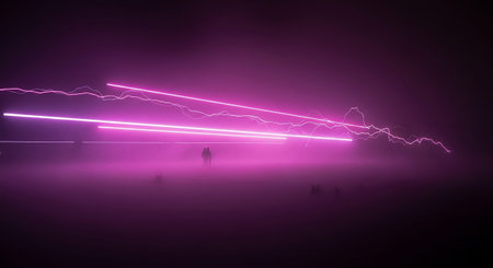 Pulsating neon lights create a vibrant rhythmic overlay on dark background