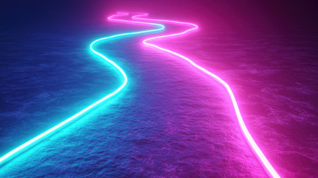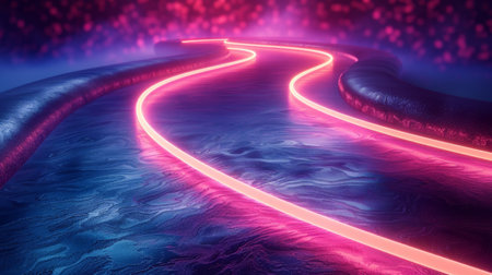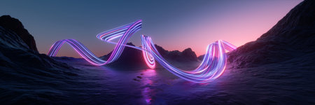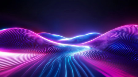 A stunning abstract landscape featuring vibrant neon light waves, creating a captivating visual experience. Ideal for technology and art themes.