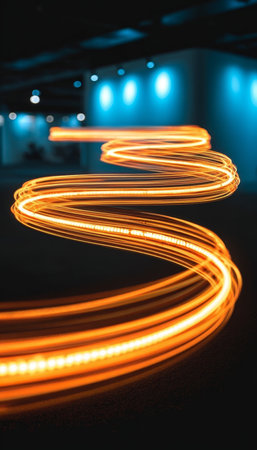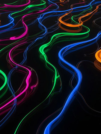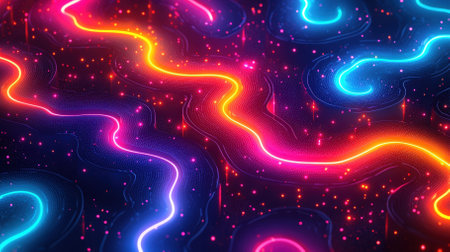 This captivating image features vibrant neon light trails meandering through a dark space, enhanced by sparkling elements. Perfect for modern designs.