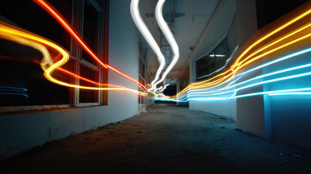 Captivating image showcasing colorful light trails in a dark abandoned hallway, creating a vibrant and dynamic atmosphere that inspires creativity.