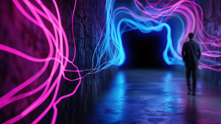 A captivating scene of a person walking through a glowing tunnel, illuminated by vibrant light trails. The abstract design evokes mystery and adventure.