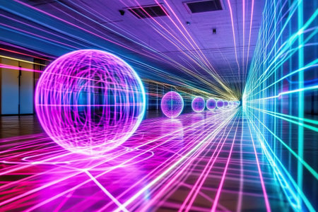 Colorful spheres and light beams illustrate the concept of quantum entanglement in a sleek, modern environment.