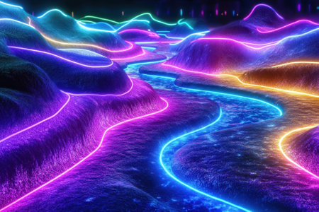 A vibrant neon river winds through surreal glowing hills, creating a mesmerizing nighttime landscape.