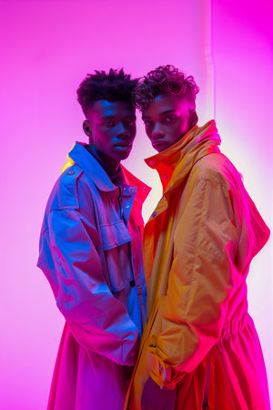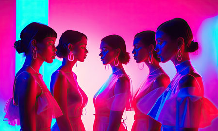 Fashion models showcase vibrant outfits in a studio setting with colorful lighting