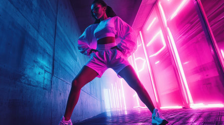 Neon sportswear in vibrant colors contrasts against a glowing background urban while showcasing energetic poses during a lively scene.