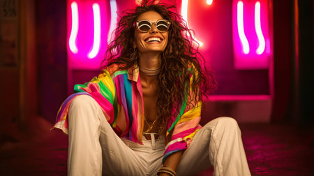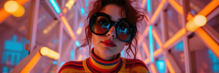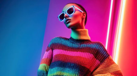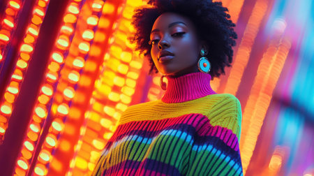 A chic woman in a vibrant sweater adorned with neon accents stands against a dazzling backdrop, merging contemporary style with festive energy