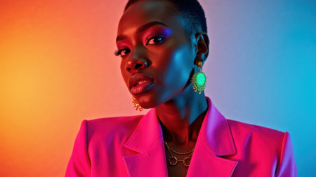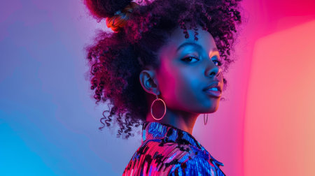 Fashionable african female adult in vibrant lighting with bold earrings.
