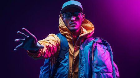 Young male model posing with trendy man fashion outfit and colorful vibrant glowing green and pink optical art abstract background. Picturesque generative AI