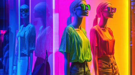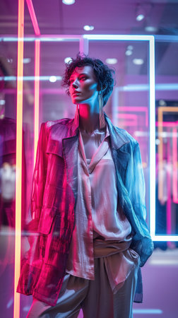 Fashion mannequin wearing stylish clothes illuminated by vibrant neon lights in a modern shop window display