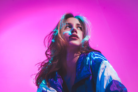 Young woman with long hair wears a colorful windbreaker, sitting against a vibrant pink background with neon light effects.