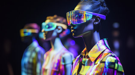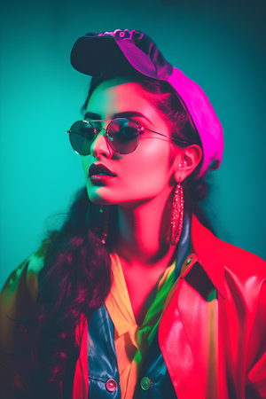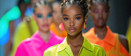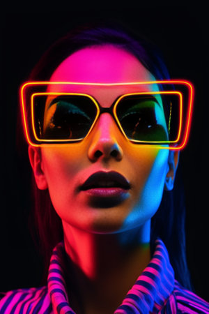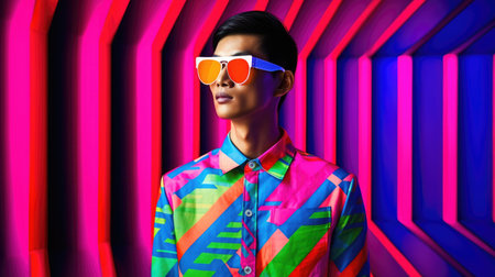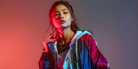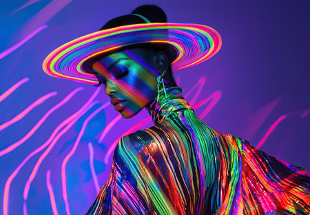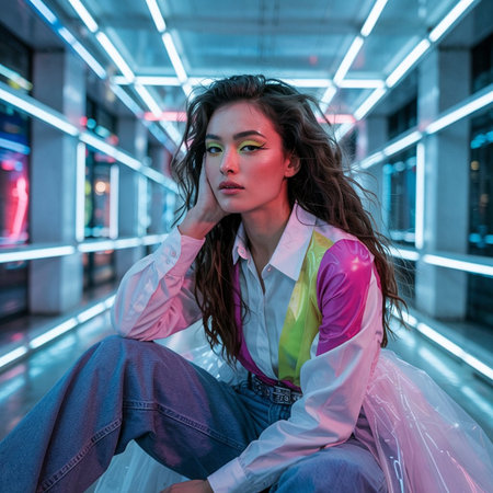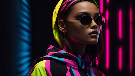 Step into the future of fashion as a young model embraces the allure of colorful neons. AI Generated.