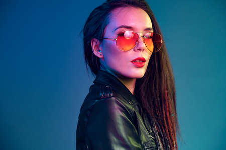 Elegance. Cinematic portrait of stylish young woman in neon lighted room. Bright neoned colors. Caucasian model, musician outdoors. Youth culture in party, festival style and music concept.