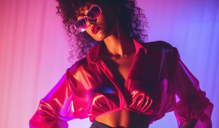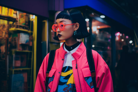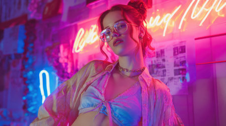 In a vibrant urban environment illuminated by neon lights, a young woman exudes confidence with her striking look. Dressed in stylish attire, she captures the essence of city life.