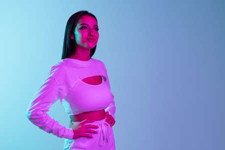 Beautiful young emotional girl, student with long dark hair isolated on gradient pink-blue background in neon light. Concept of emotions, youth