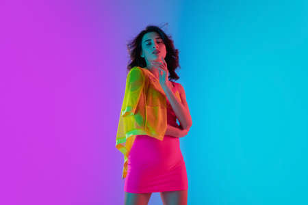 Young womans portrait on gradient colors studio background in neon. Concept of human emotions.