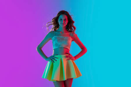 Young caucasian longhair girl posing, dancing stylish in colorful neon light on dark background. Celebration, holiday, weekend, nightlife and positive vibes. Looks fashion and confident, youth culture.