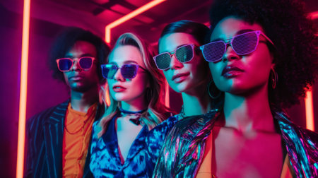 Vibrant Fashion Models Sporting Trendy Sunglasses and Colorful Outfits at a Neon Lit Party AI Generative