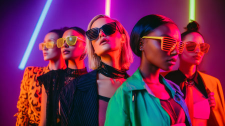 Futuristic fashion: diverse young female models wearing vibrant neon glasses.