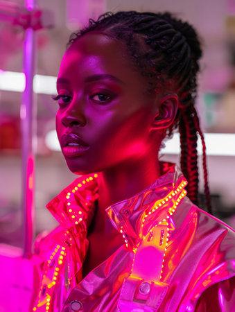 Fashion Model with Neon Lights Photography, African Woman Portrait in Glowing Jacket, Urban Style AI Generative