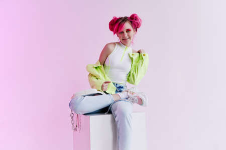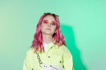 cheerful woman with bright makeup pink hair Glamor posing fun