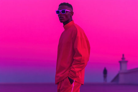 Stylish male model in red sportswear with sunglasses against a vibrant pink sunset background, conveying confidence and urban fashion