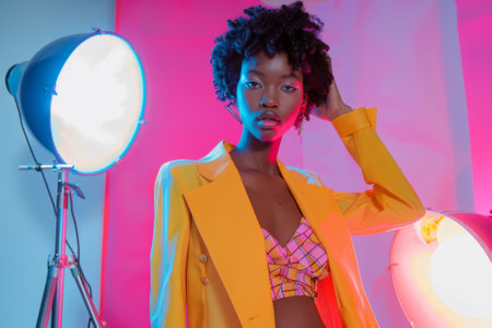 Stylish Black woman confidently posing in a brightly lit room. Fashionable young lady striking a pose in a colorful creative studio environment, working for a luxurious fashion brand.