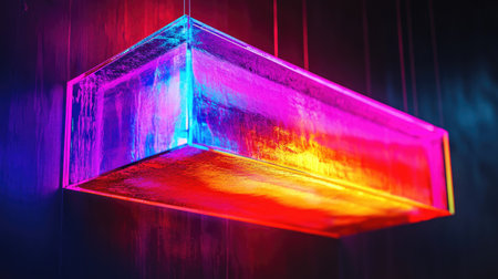 Close-up of a vibrant rectangular object with colorful lights on a dark backdrop.