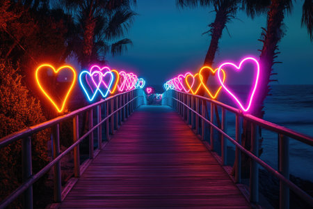 Colorful neon hearts illuminate a wooden pier leading to the ocean, creating a romantic and vibrant atmosphere at twilight