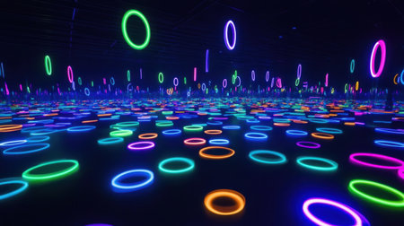 This mesmerizing image features vibrant neon light rings scattered across a dark surface, creating an eye-catching abstract background ideal for creative projects.