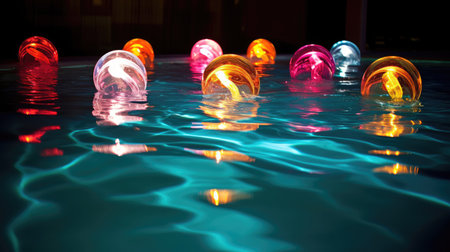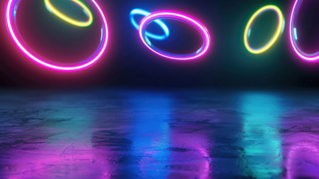 Vivid neon circles float in a dark environment, casting reflections on a smooth surface, evoking a lively and futuristic ambiance perfect for creative projects.