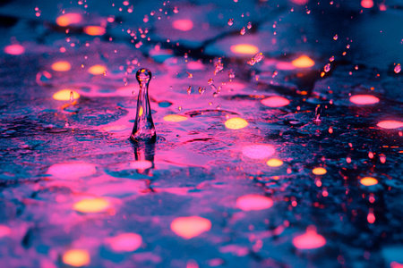 Raindrops fall into shimmering puddles of glowing pink, creating beautiful splashes and ripples that catch the light, evoking a magical atmosphere at twilight