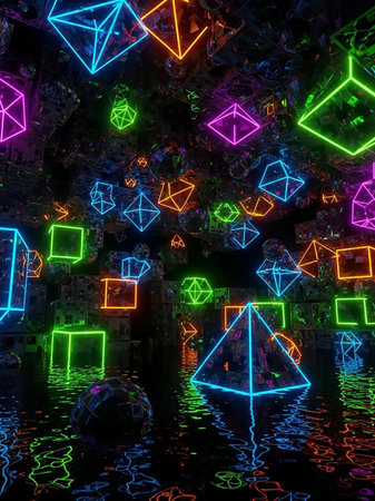 Neon illuminated geometric shapes reflecting on a wet surface during the night