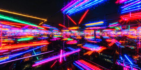 This captivating image features vibrant neon light trails meandering through a dark space, enhanced by sparkling elements. Perfect for modern designs.