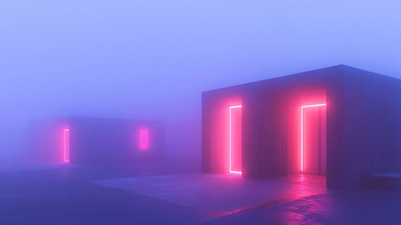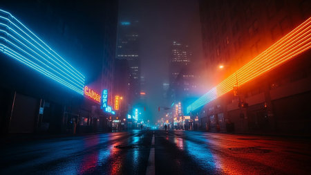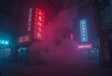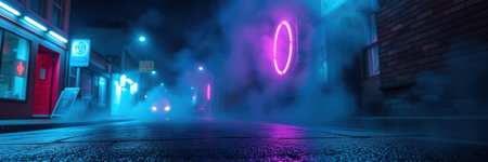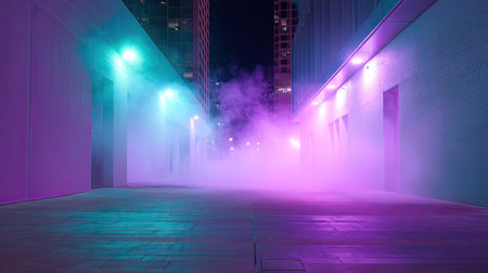 This captivating urban scene features vibrant neon lights and mysterious fog enveloping an alleyway. The modern architecture combines with captivating shadows to create an intriguing nightlife atmosphere.
