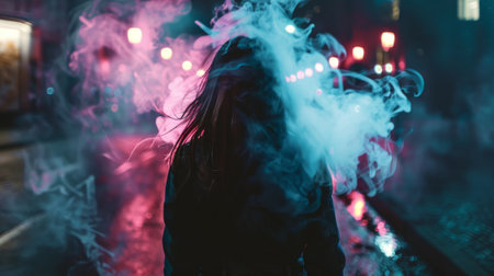 A mysterious woman walks through a street enveloped in neon-lit smoke, creating a dramatic and cinematic urban atmosphere at night.