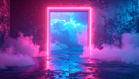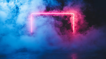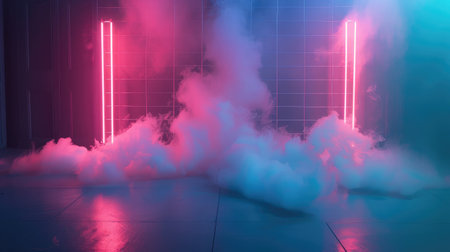 A stunning visual featuring futuristic neon lighting with vibrant pink and blue hues, surrounded by colorful smoke. Perfect for artistic projects and modern themes.