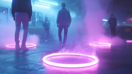 Silhouettes of people are visible, standing near vibrant pink and purple neon rings that emit light and smoke, creating an ethereal and futuristic atmosphere on the ground.