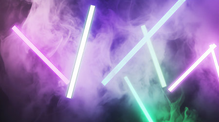 Colorful neon lights intersecting with smoke, creating a futuristic and abstract design