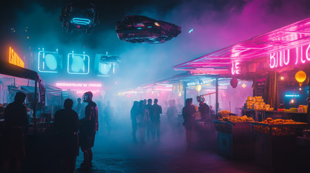 An atmospheric night scene featuring vibrant neon lights glowing against a backdrop of thick fog in an urban environment, evoking mystery and intrigue.